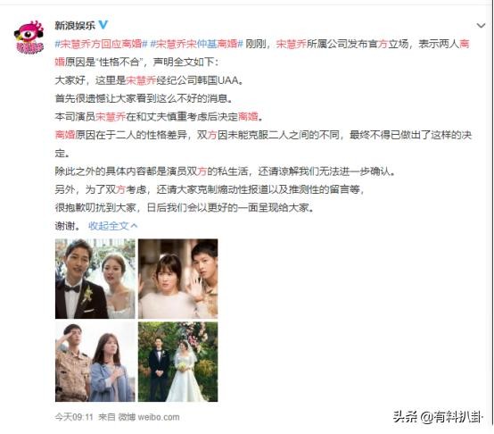 宋慧乔所属公司发布官方立场,表示两人离婚原因是“性格不合”,声明全文如下: