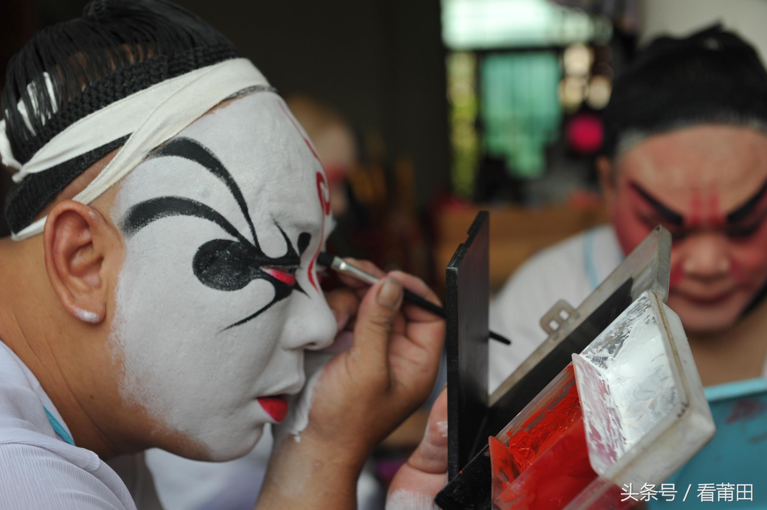 中午12点多一团的演员就开始化妆了,一般化妆加梳头要花1个多小时。有时候后台工作环境差,演员会选择在家化好妆,再到后台弄头饰。