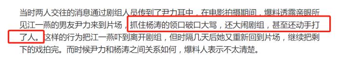 没多久,这事儿便被尹力知道了,一怒之下跑到片场对杨涛破口大骂,情急之下还动了手。