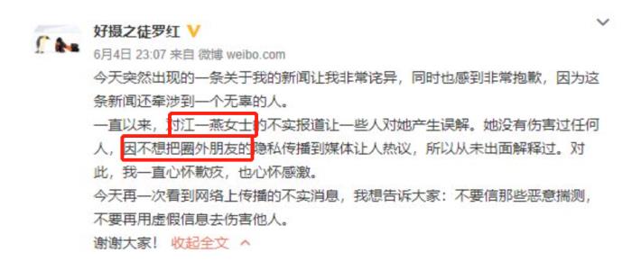 有趣的是,2019年罗红在微博上突然澄清自己与江一燕的关系,声称两人只是多年好友,而后他又摆出了前妻签字的声明,表示两人离婚只是因为罗红太爱摄影。