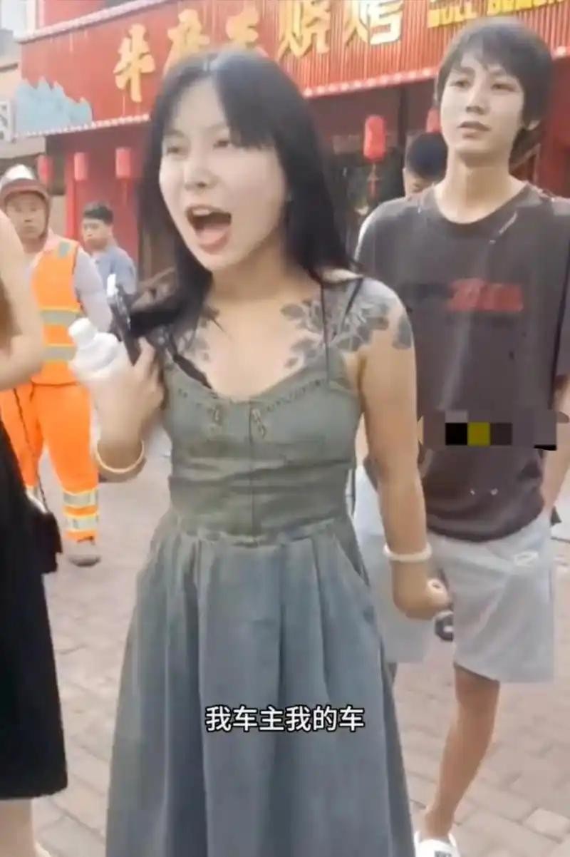这女的穿着一件灰色长裙,那裙子也遮不住她身上大片的暗色系纹身,脚上还趿拉着一双拖鞋,那打扮,真是要多张扬有多张扬。