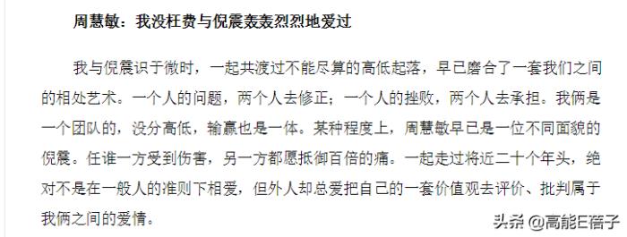倪震用的标题是“人头落地了,希望事情可以告一段落”;而周慧敏则是“我没枉费与倪震轰轰烈烈地爱过”。说是分手声明,字里行间更像是爱人间深情互诉衷肠。