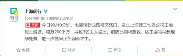 据上海市闵行区政府消息,今日9时10分许,闵行七宝镇新龙路号文路口,发生上海建工七建公司工地泥土滑坡,塌方200平方,导致3名工人被压,消防已到场施救,区主要领导赴现场处置,进一步情况正在调查之中。 (北青报记者 郭琳琳)