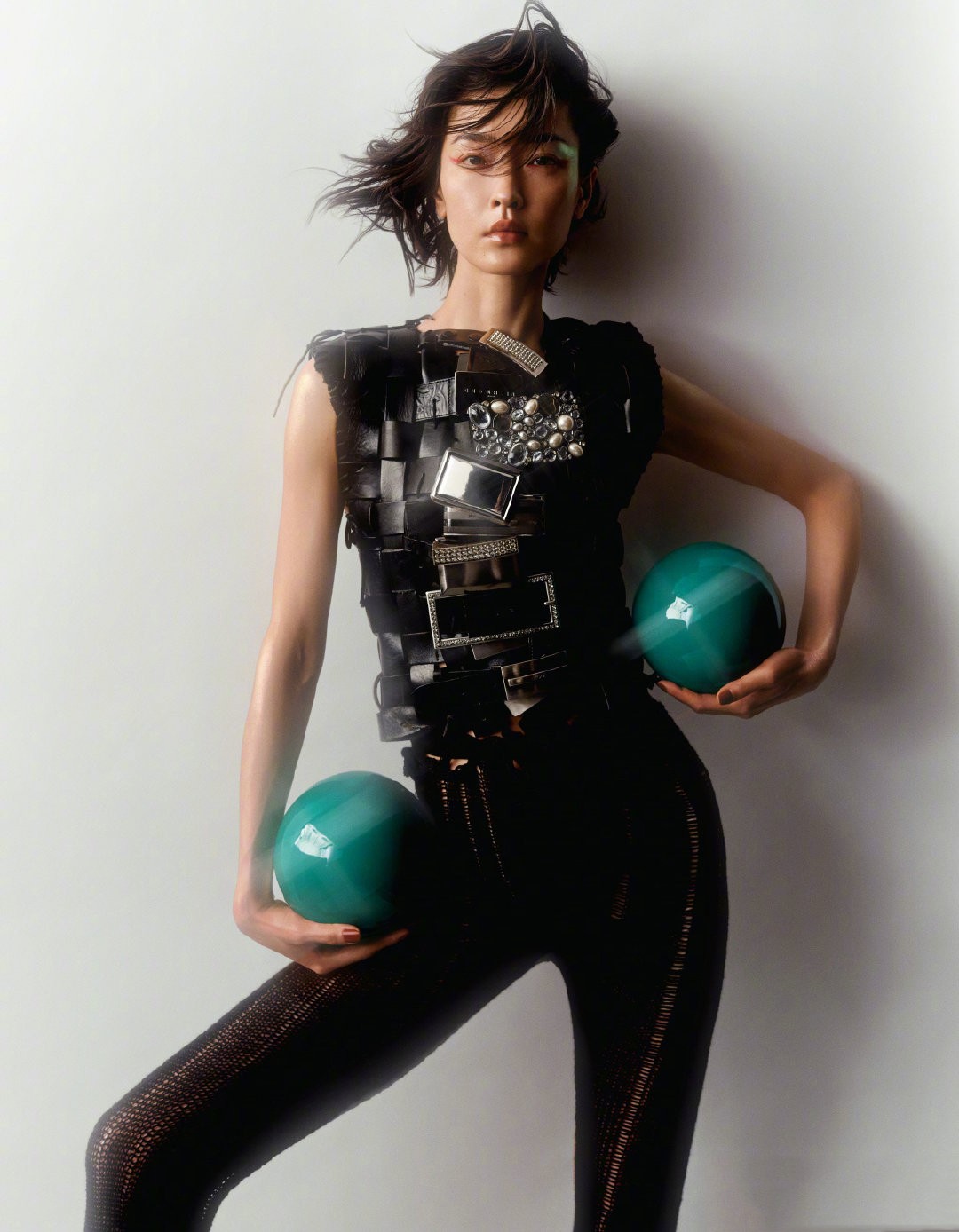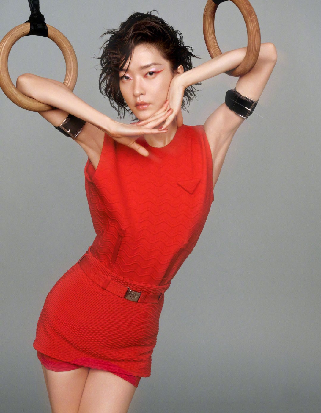 因为这次写真以运动为主题,所以也借助了不少运动员使用的器材,画面很有力量感,复古健美操造型与时尚完美融合,时尚表现力满分。