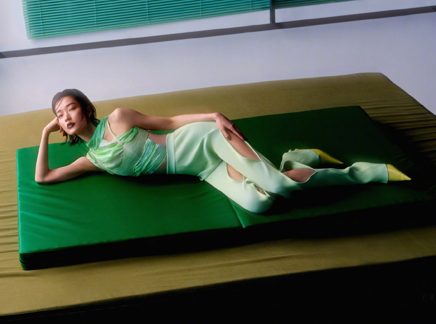 杜鹃躺在墨绿色的垫子上面,造型随性慵懒,肢体语言写意放松,简单姿势释放个人魅力,又性感又有个性。