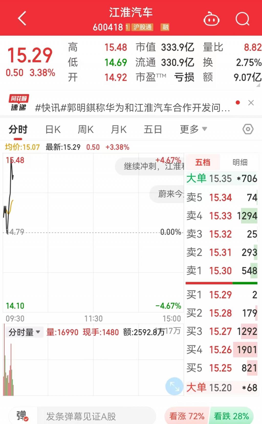 受消息面影响,江淮汽车股价今日开盘一度直线拉升,截至发稿,江淮汽车(SH600418)报 15.29 元 / 股,涨幅 3.38%,市值 333.9 亿元。