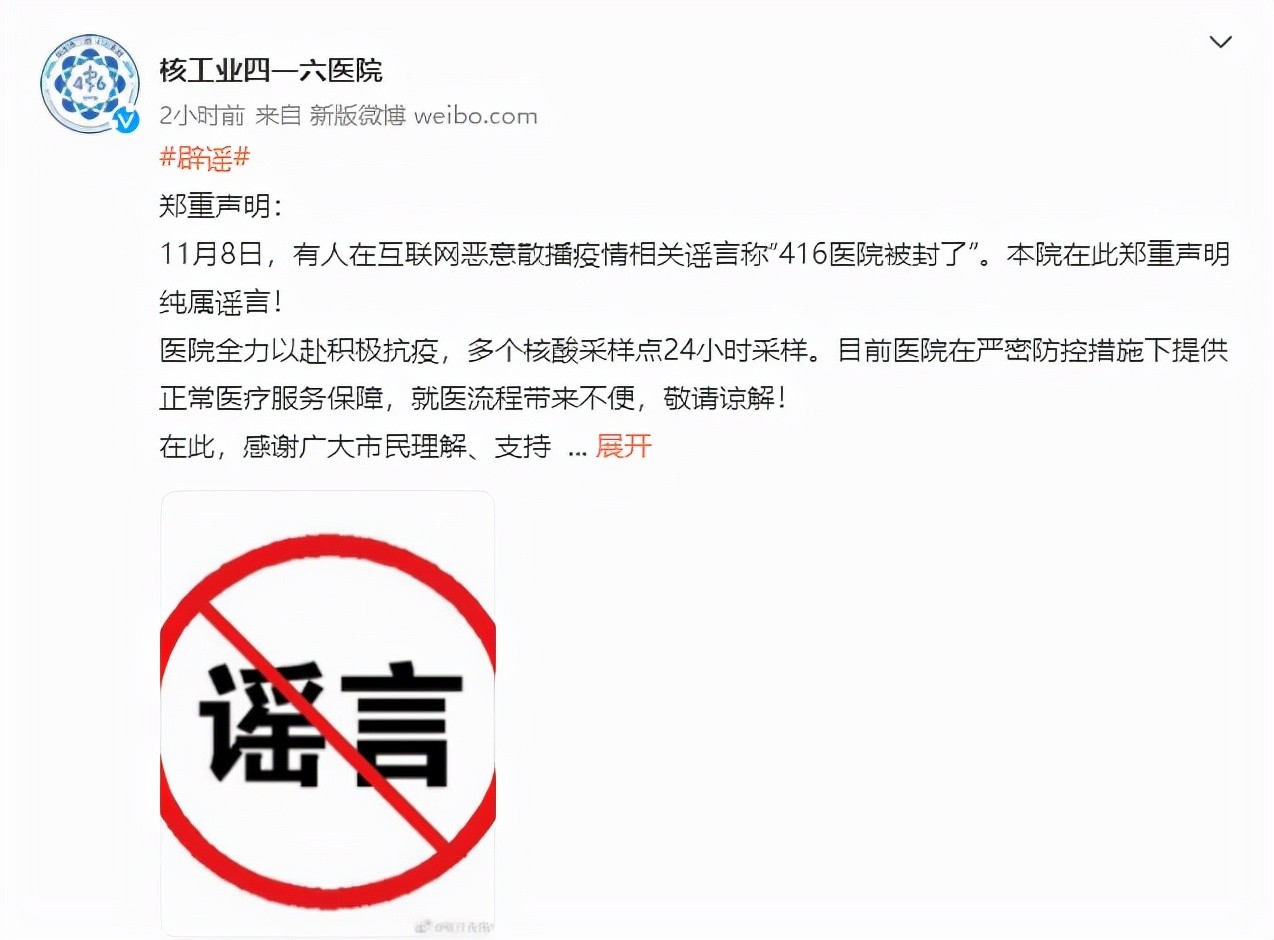 11月9日,成都医学院第二附属医院-核工业四一六医院发布郑重声明:11月8日网络传播的“416医院被封了”纯属谣言!