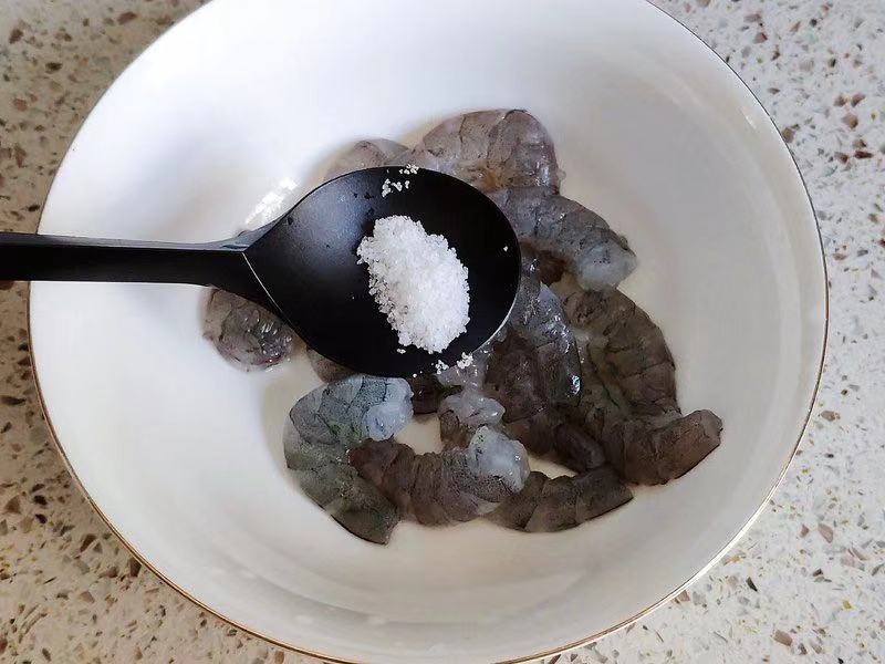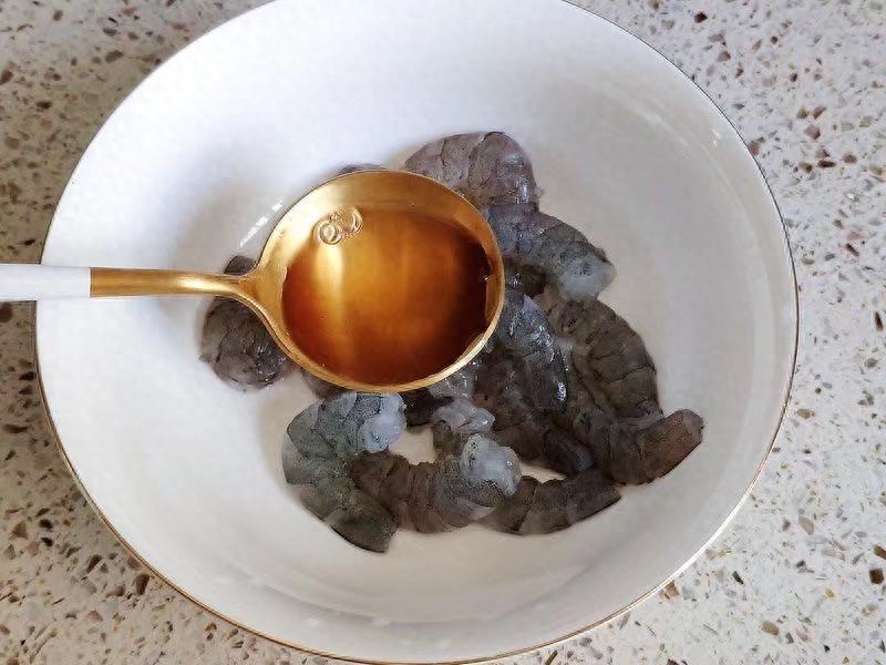 1.鲜虾买回来先放冰箱冷冻半小时,比较容易剥壳,鲜虾去壳,挑去沙线,清洗干净沥干水分,加入一勺料酒