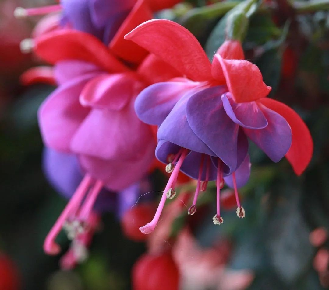 倒挂金钟原产秘鲁、智利、墨西哥等中南美洲国家。花梗细长,花朵下垂,花萼筒状似钟,开花时犹如一个个悬垂的彩色灯笼或金钟,随风飘荡,非常艳丽。