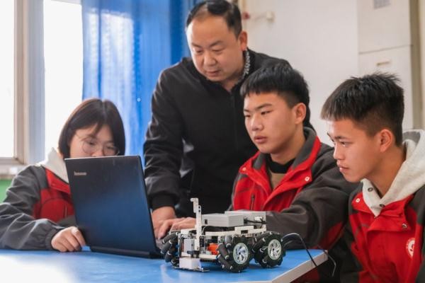 ↑1月8日,老师在柏乡县柏乡中学创客空间教室指导学生编程。