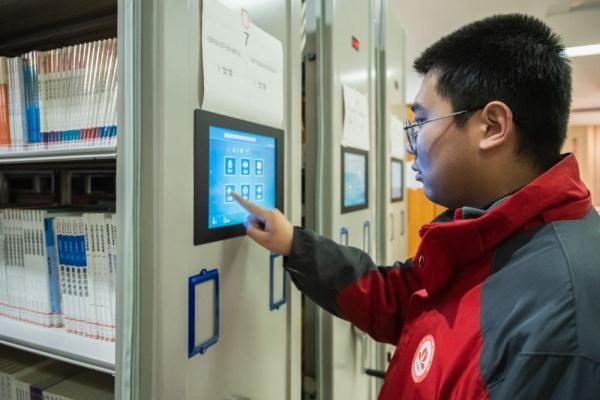 ↑1月8日,学生在柏乡县柏乡中学图书室操控图书馆智能借阅系统借阅图书。