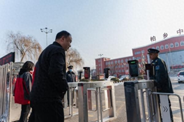 ↑1月8日,师生在柏乡县柏乡中学门口通过智能门禁系统识别后进入校园。