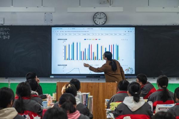 ↑1月8日,学生在柏乡县柏乡中学智慧课堂互动系统完成作业后,老师对成绩进行当堂分析。