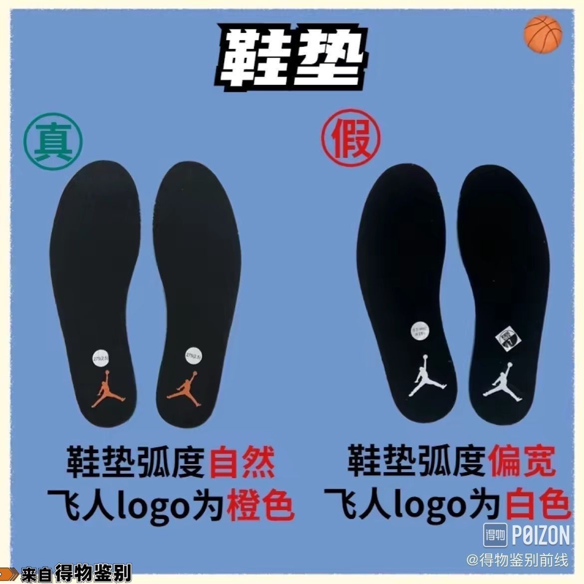 假:鞋垫弧度偏宽,飞人logo为白色