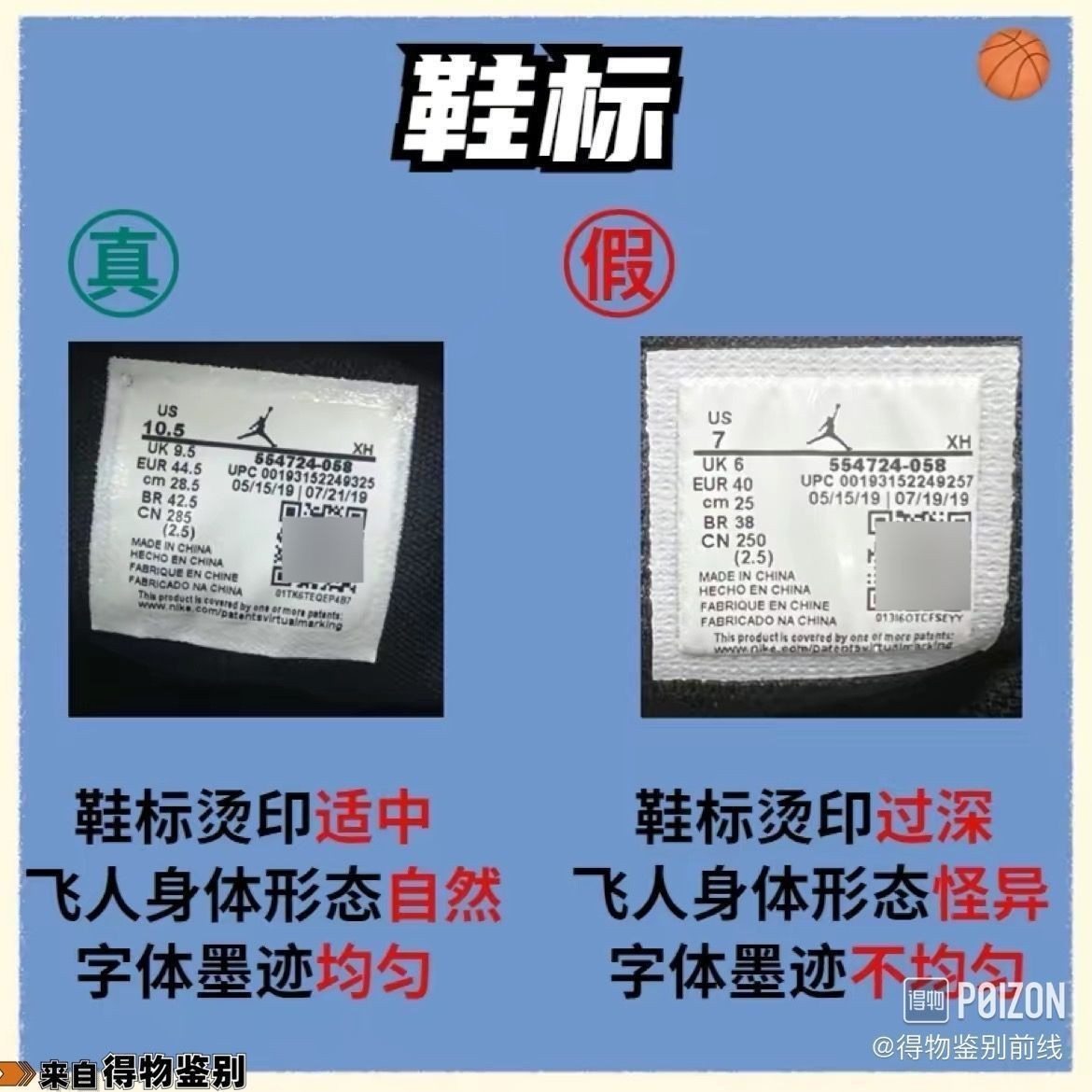 假:鞋标烫印过深,飞人身体形态怪异,字体墨迹不均匀