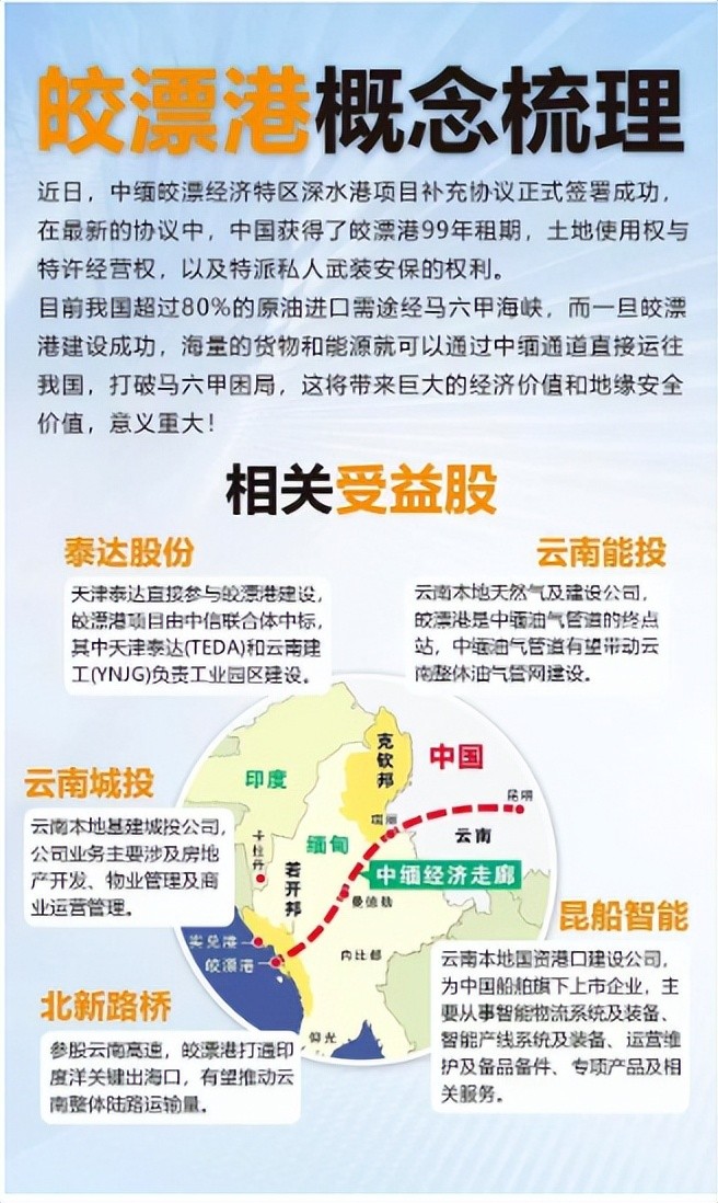近日,中缅蛟漂经济特区深水港项目补充协议正式签署成功在最新的协议中,中国获得了皎漂港99年租期,土地使用权与特许经营权,以及特派私人武装安保的权利。目前我国超过80%的原油进口需途经马六甲海峡,而一旦皎漂港建设成功,海量的货物和能源就可以通过中缅通道直接运往我国,打破马六甲困局,这将带来巨大的经济价值和地缘安全价值,意义重大!