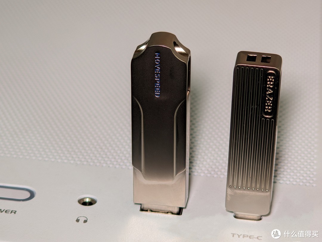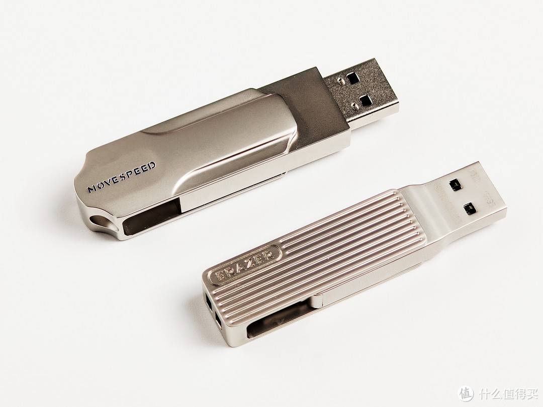 四款U盘都采用了360度旋转设计,可以很方便的进行双接口切换,转动方面其它三款转动所需力度较小,移速灵动Pro转动所需力度相对较大,在有些特殊场景下反而更加好用,比如我家的电视的USB接口在侧面比较深的位置,只能拎着U盘的尾部去插入,如果转动太松很容易因为发生旋转导致插入失败。