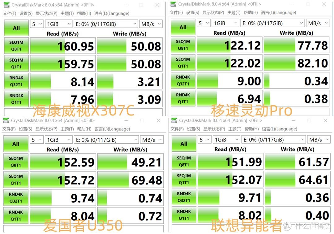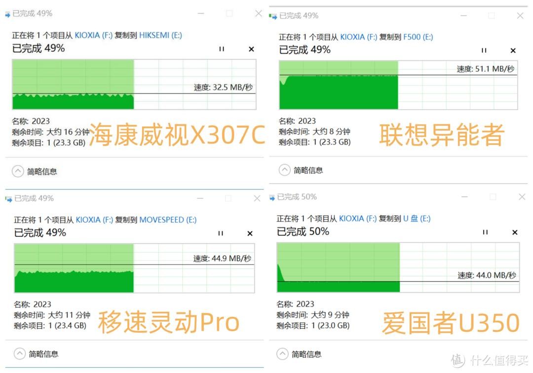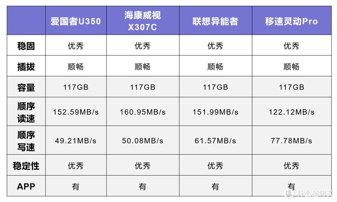 小啥点评:四款U盘稳固性都十分优秀,插拔顺畅,顺序读取海康威视X307C最优,顺序写入移速灵动Pro最优, 移速灵动Pro的平均读写速度更稳定。