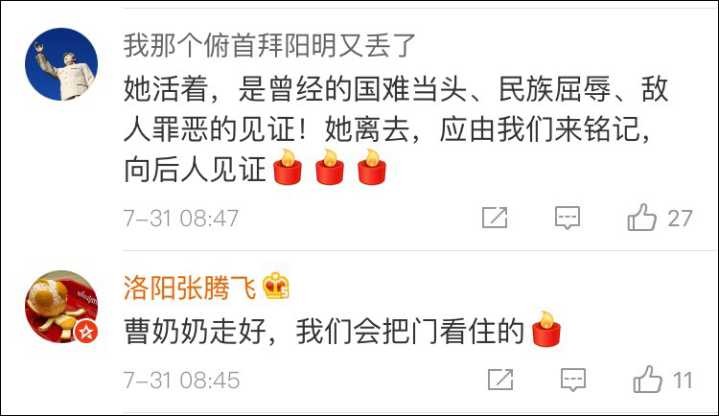 大批网友也通过微博,寄托了对老人的哀思:奶奶您放心,我们一定把家门看得牢牢的,再不能让人家说踢开就踢开!