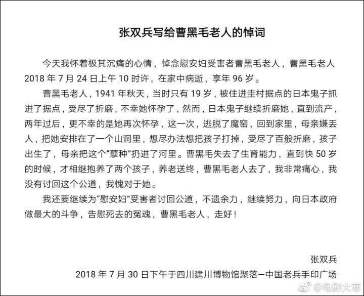 每一位老人离世,张双兵都要为她们写一篇悼文。30日,远在四川的张双兵写道,他仍会继续努力,“为受害者讨回公道”、“向日本政府做最大的斗争”。