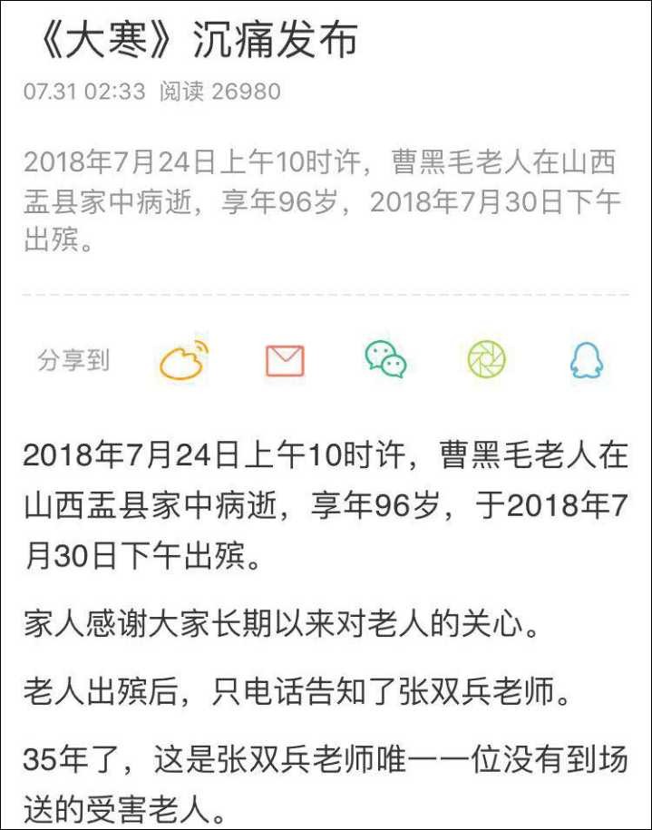 7月31日凌晨2点33分,电影《大寒》官微发布了一篇题为“《大寒》沉痛发布”的文章。原来,曹黑毛老人已于24日上午10时许,在盂县家中病逝,享年96岁,并于7月30日下午出殡。