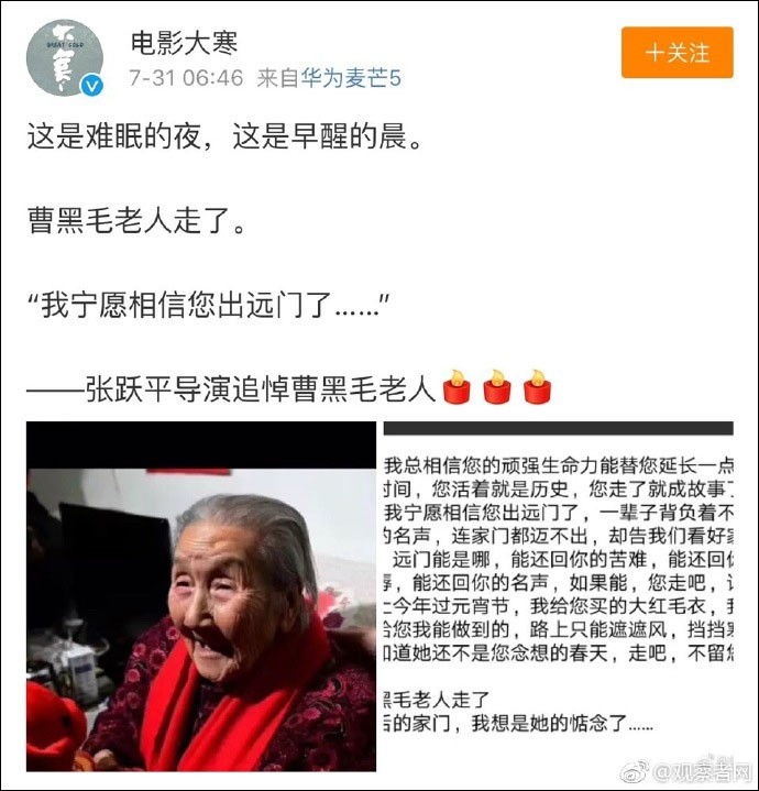 31日早上6点46分,《大寒》官微再次发布一篇了导演张跃平追悼曹黑毛老人的文章,“这是难眠的夜,这是早醒的晨”、“我宁愿相信您出远门了……”
