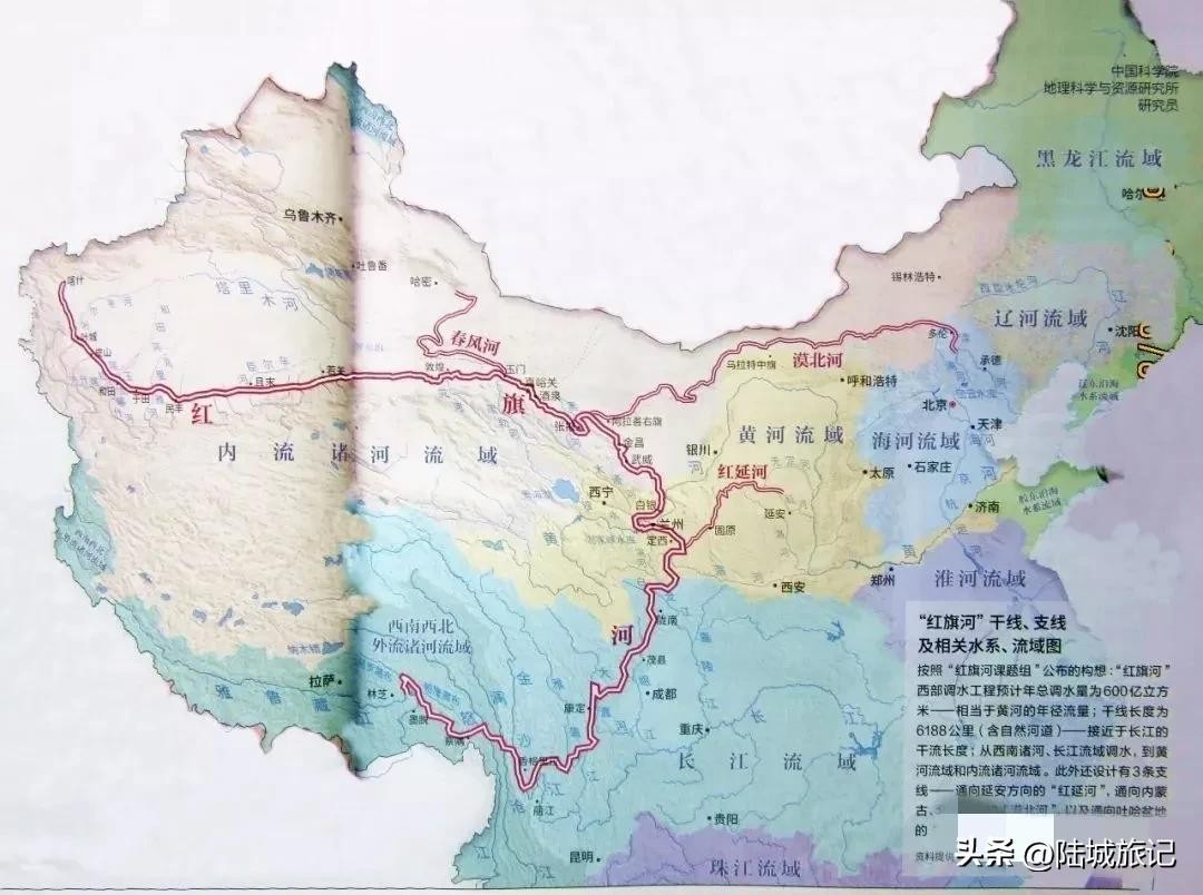 【红旗河工程】:该方案工程分为一条主干流——红旗河和三条分支流——春风河、漠北河、红延河;再由这些人工河流分出多条输水支流,该工程以人工河流、管道、人工湖、水库、取水站等系列配套组成完整的红旗河工程。