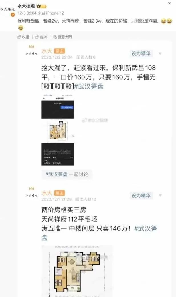 博主还提到了其他类似的案例。例如,保利新武昌,曾经的均价2万/平方米,如今一套108平方米的房子挂牌价格为160万;天祥尚府,曾经的均价为2.3万/平方米,如今一套112平方米的毛坯房满五年唯一,挂牌价为146万。