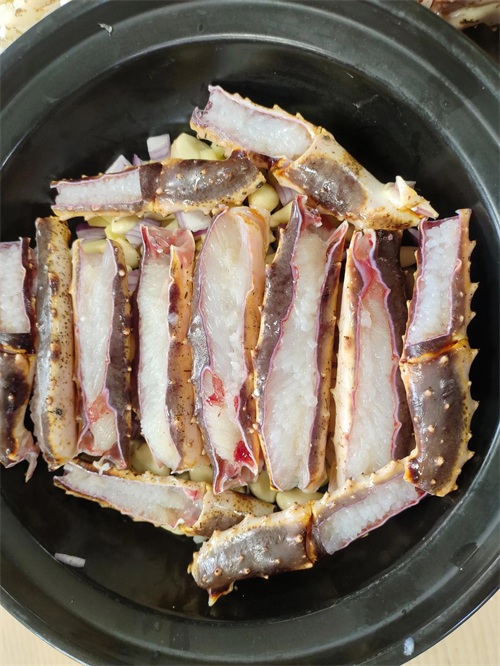 首先帝王蟹用剪刀从大腿根部依次剪断,小腿也是一样,大小腿用刀竖着切掉外皮,准备一个大砂锅放入,大蒜子,姜丁,圆葱丁垫底,依次摆上