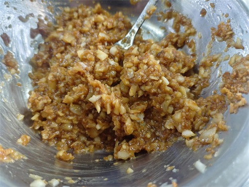 第二步:轻轻的掀开蟹壳去除内脏和腮腺,保留蟹黄,这时剩下的大腿依次用刀剁开备用,粉丝温水泡发控干水分后摆入盘中,转圈摆入蟹腿,放入蒜蓉酱,蒜蓉酱制作方法:大蒜子切莫用凉水洗净控干水分,一半留着,另一半加油小火炸至金黄,趁热倒入小碗里面,加耗油15克,鸡汁10克,味精5克,胡椒粉5克。白糖5克,凉拌均匀,