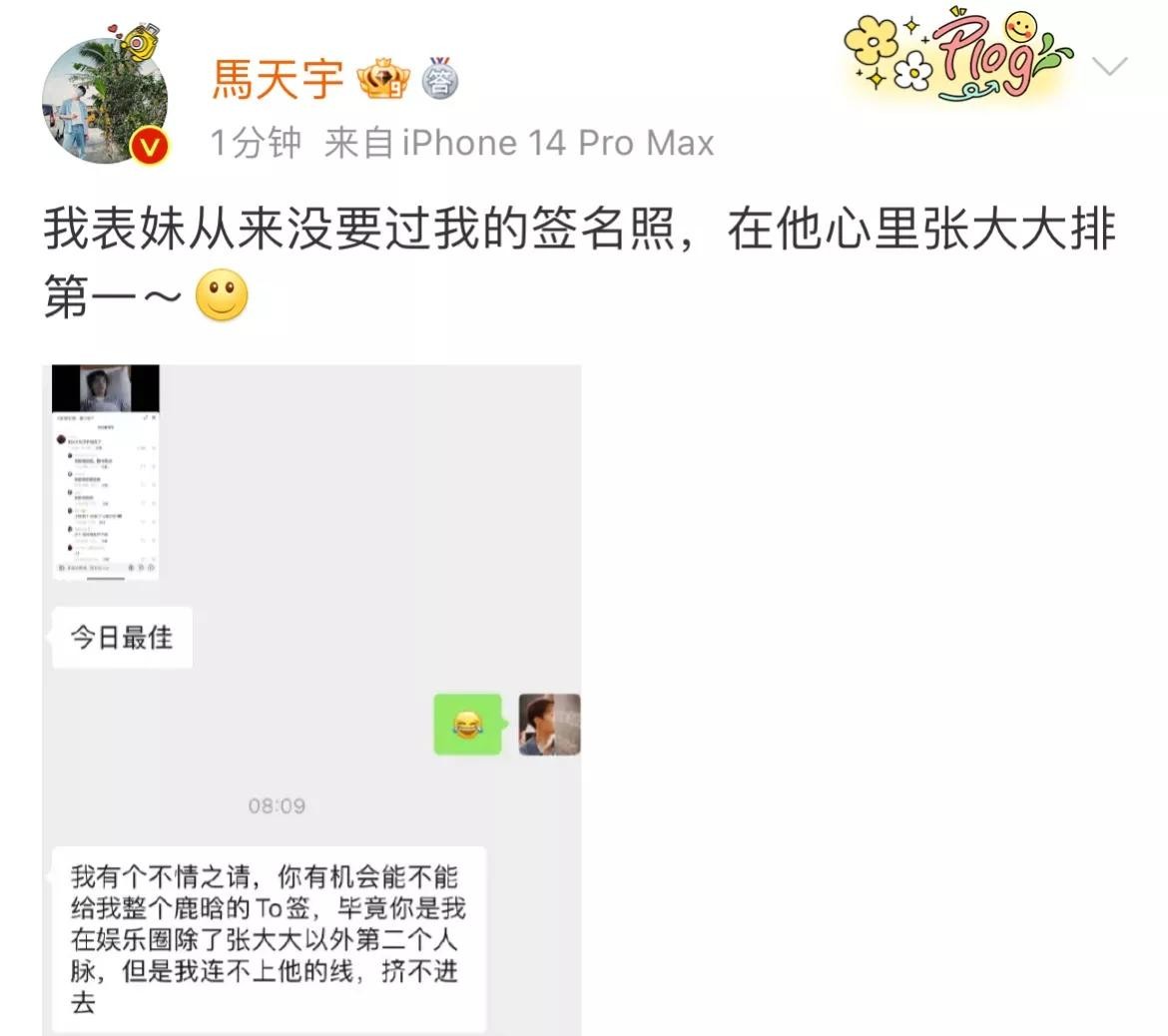 马天宇发文,自己的表妹没有要过自己的签名照,而且张大大在她心里排第一。