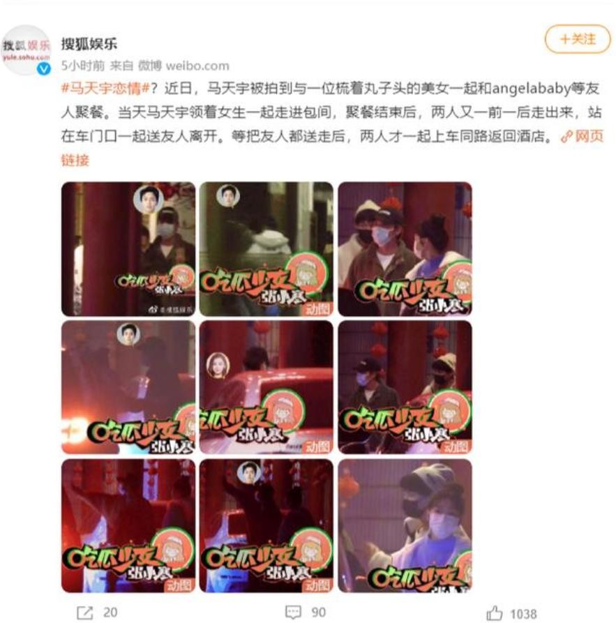 有人拍到马天宇和剧组的一个女演员一同进出,照片中,两个人的举止十分亲密,似乎已经超出正常的友情范围了。