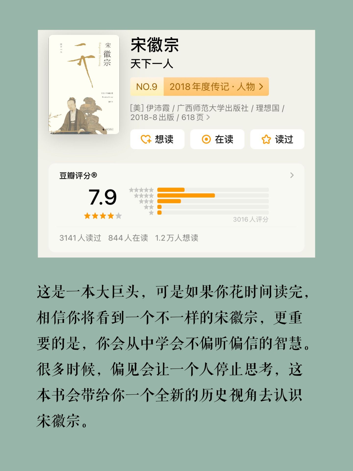 这是一本大巨头,可是如果你花时间读完,相信你将看到一个不一样的宋徽宗,更重要的是,你会从中学会不偏听偏信的智慧。很多时候,偏见会让一个人停止思考,这本书会带给你一个全新的历史视角去认识宋徽宗。