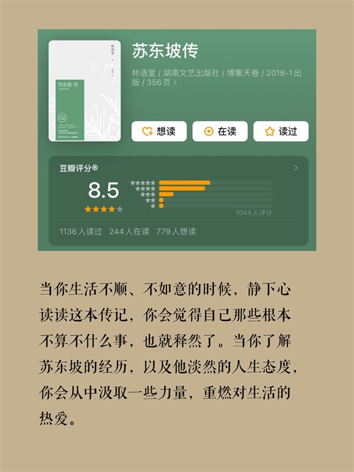 当你生活不顺、不如意的时候,静下心读读这本传记,你会觉得自己那些根本不算不什么事,也就释然了。当你了解苏东坡的经历,以及他淡然的人生态度,你会从中汲取一些力量,重燃对生活的热爱。
