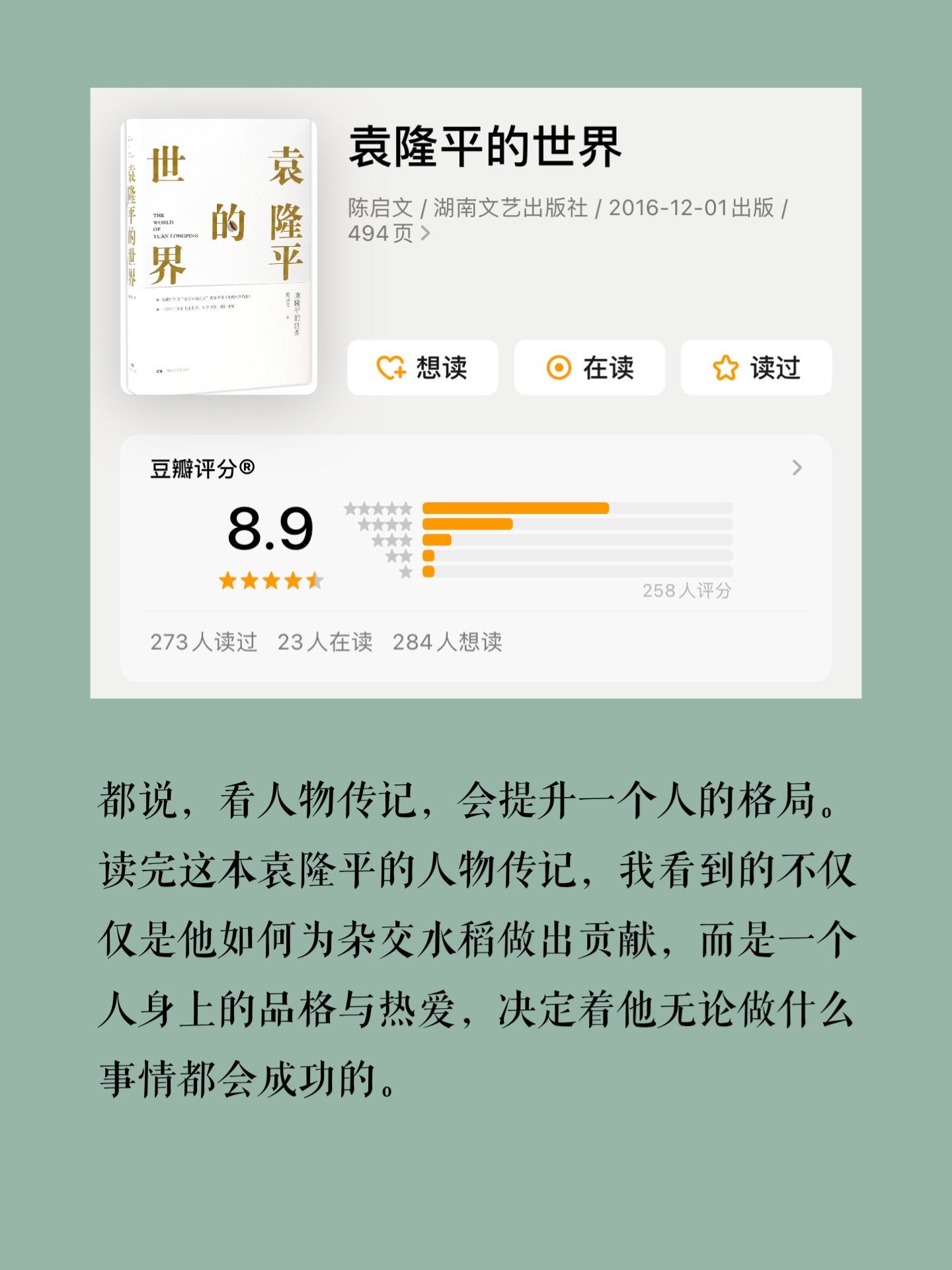 都说,看人物传记,会提升一个人的格局。读完这本袁隆平的人物传记,我看到的不仅仅是他如何为杂交水稻做出贡献,而是一个人身上的品格与热爱,决定着他无论做什么事情都会成功的。