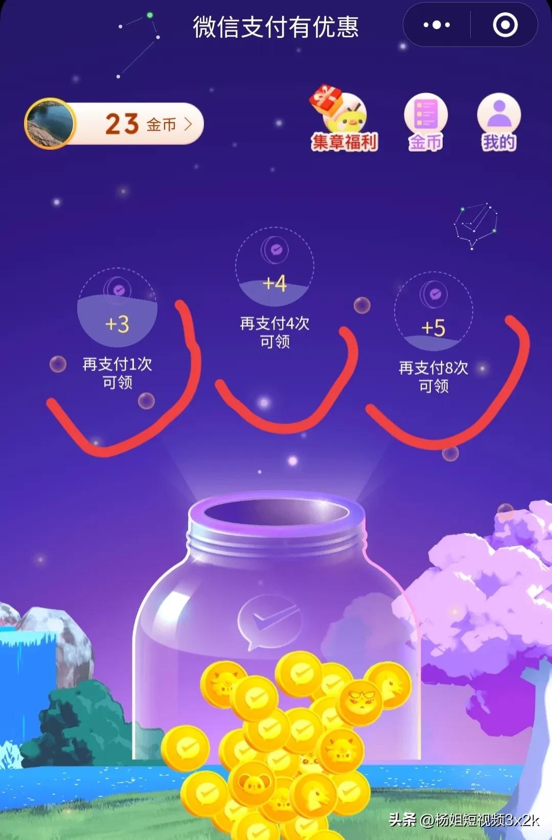 第2步进入微信支付以后,点击右下方的[支付服务],接着就可以使用更多功能,然后点击[支付可享优惠],就来到了活动页面,金币是平台为了鼓励消费者使用微信支付这个功能,给予的奖励。只要我们使用微信支付在商户处消费,单次满一元以上,就有一次金币奖励,但一天在同一商户消费满三次以上的,封顶只按三次计算。奖励的金币就在这个页面解锁点击领取