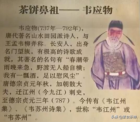 在此期间,韦应物偏爱上了浔阳楼一卢姓厨师所作的佐茶小饼,询问后得知还未起名,便说此饼适合佐茶,就叫它“茶饼”吧!从此,“浔阳楼茶饼”声誉日隆并广为传播,后人为表示感激,更是将韦应物尊为茶饼之开山鼻祖。