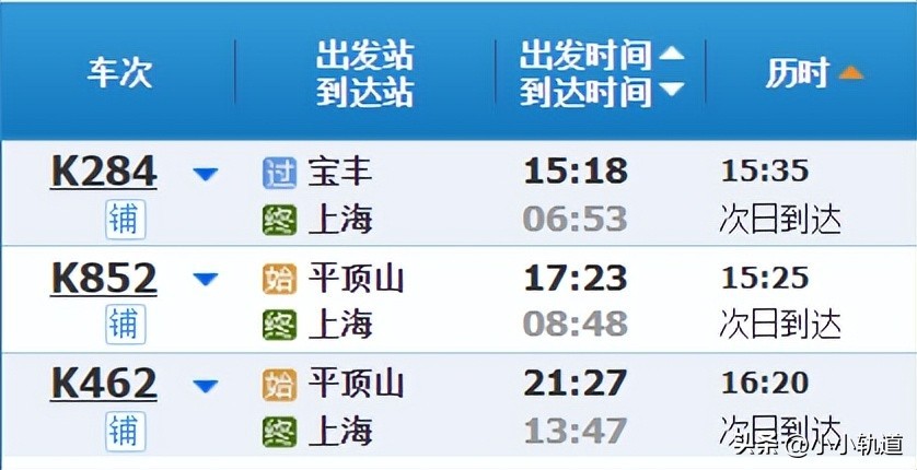 目前,平顶山至上上海每天有3个车次的普速列车,其中,K462次列车耗时为最长,用时为16小时20分钟;K852次列车耗时最短,用时为15小时25分钟。