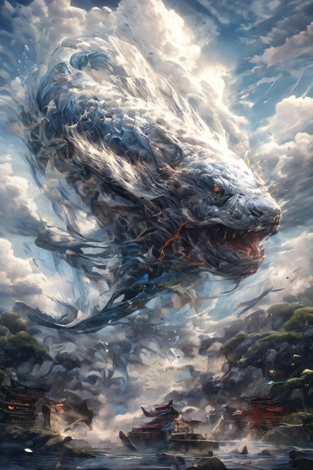 然而,鲲不仅仅是一条巨鱼,它还拥有变化的能力,能够化身为一种同样巨大的鸟类,这种鸟被称为鹏。鹏的背部宽广无比,同样无法用几千里来准确衡量其广阔。当鹏愤怒地振翅高飞时,它的翼展宛如天空中低垂的云层,壮观至极。