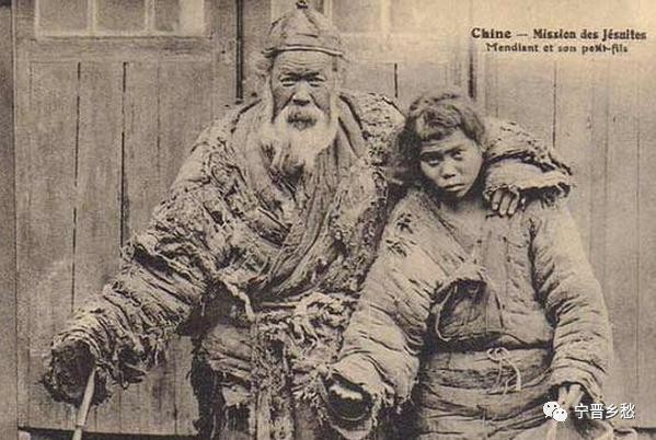 清末照片,一个老乞丐拄的拐杖,身上穿的破破烂烂的带着孙子去逃荒。