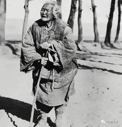 晚清的一位老妇,白发苍苍,拿着枯枝做拐棍。