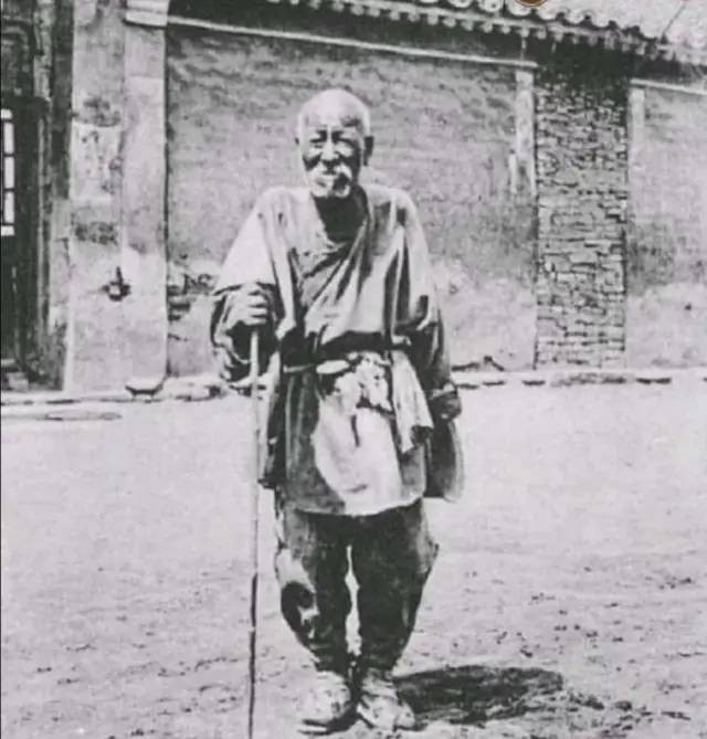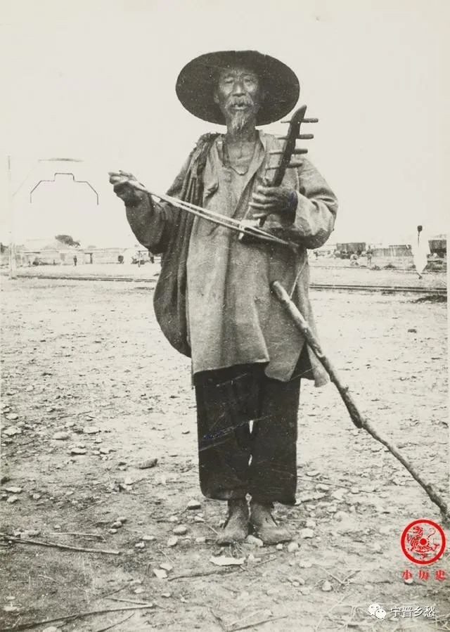 清末照片,卖艺求乞的老人,打狗棒在一旁。