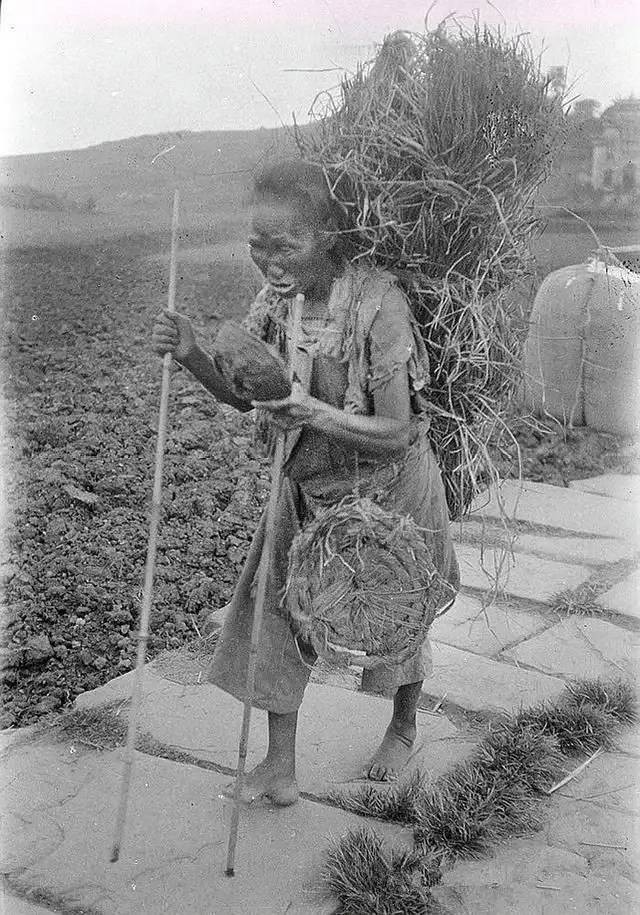 清末照片,农村田野中的小道上,一名老奶奶从集镇上乞讨归来,拿着两根棍子,身后还背了一捆稻草。