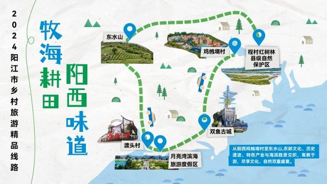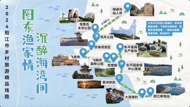 绿道与仙人井——鸳鸯石乡郊公园——风车公园——珍珠湾景区——飞龙寺——飞鹅岭森林公园——鸳鸯路——东平莲藕生产基地——东平国家级中心渔港——葛洲帆影——大澳渔村——阳江核电站
