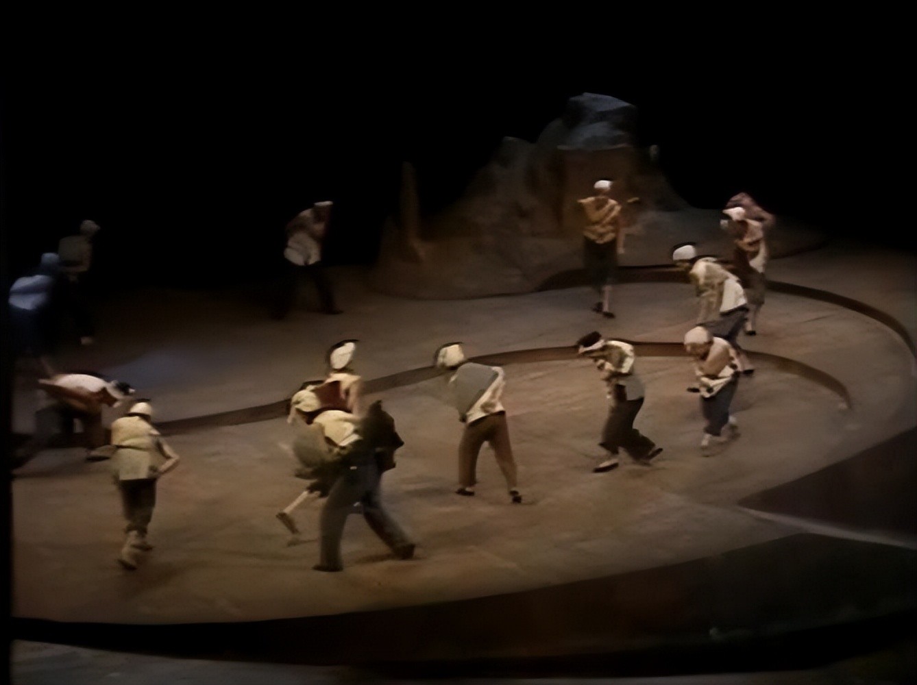 圆形舞台在话剧的舞台设计中并不罕见。"圆"本身象征着平衡和轮转,具有无限的包容性。在《桑树坪纪事》中,圆形的转台被赋予了一种"囚困"的意义,暗示着无边无界的困境,无法找到解脱之路。