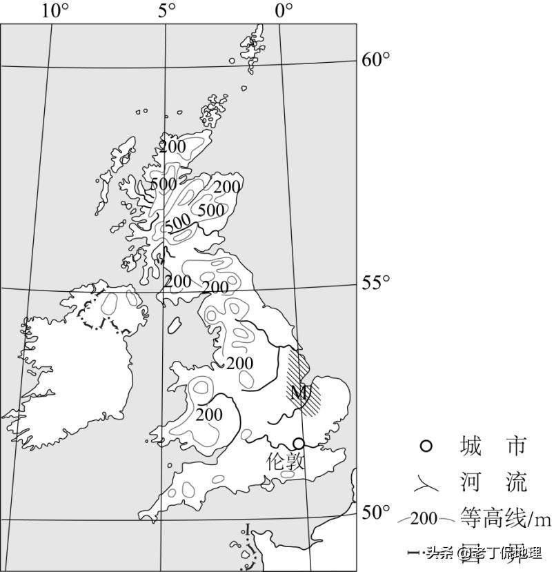 下图中阴影示意的M地区曾经是湿地(沼泽),年降水量是年蒸发量的1.2~1.5倍,远低于英国西部和北部。在罗马时代,人们对M地区湿地进行了排水尝试,湿地仅得到零星开垦。17世纪,该地引入荷兰风车与水利工程技术,湿地得到成片开垦。经过几百年的开发,M地区已经成为英国重要的农产品生产基地,但也存在诸多问题。
