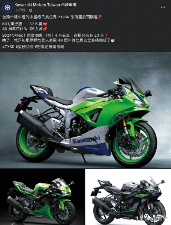 已经申报内地3C认证的川崎ZX-6R,近日在台湾省率先发布了,这款中排量仿赛的上市售价为63.6万新台币起,约合RMB 14.7万元,40周年纪念版约RMB 15.4万元。