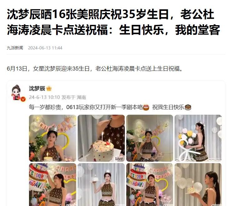 九派新闻2024年6月13日——沈梦辰晒16张美照庆祝35岁生日,老公杜海涛凌晨卡点送祝福:生日快乐,我的堂客