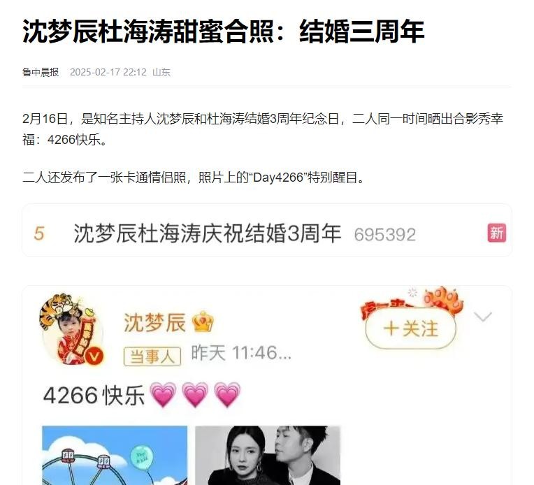 鲁中晨报2025年2月17日——沈梦辰杜海涛甜蜜合照:结婚三周年