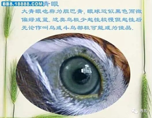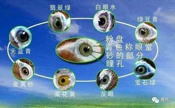 大家在选鸟时,要求鸟的眼盘要大,额角要宽,并凸突饱满而有神。鸟的整个眼膛开阔、光亮,眼神机灵敏捷,瞳孔收缩细小、晶亮,对光反应敏感,瞳孔底色泽为天蓝色或白云状(有的人认为红色、天蓝色鸟的性格偏烈,富神经质,斗性也较强,白云状者偏温,性情好)。其它色泽为次之。